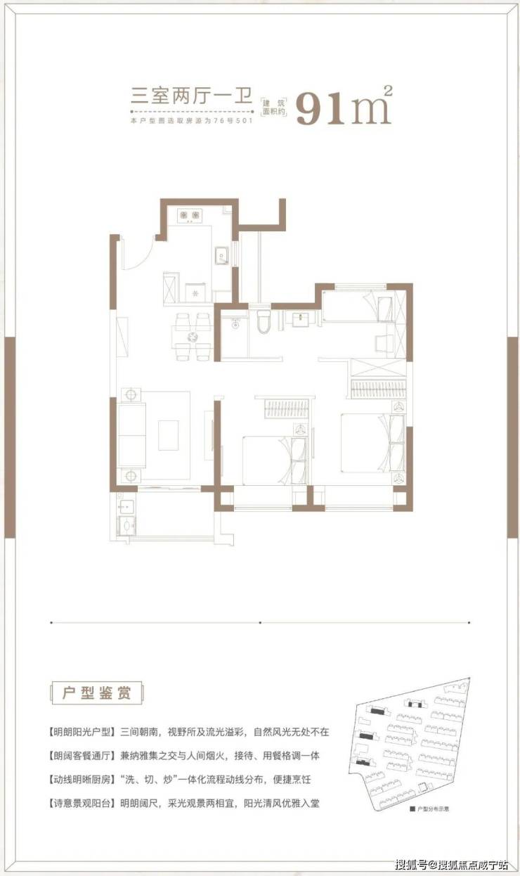 建面约91㎡3房2厅1卫户型,做到了三开间朝南+双朝南卧室带飘窗+动静分离+卫生间干湿分离,采光面拉到极致的小3房户型。这是一个相对主流户型,受众面大,三口、四口之家居住都非常适合,未来流入二手房市场,也能收获下家更多青睐。