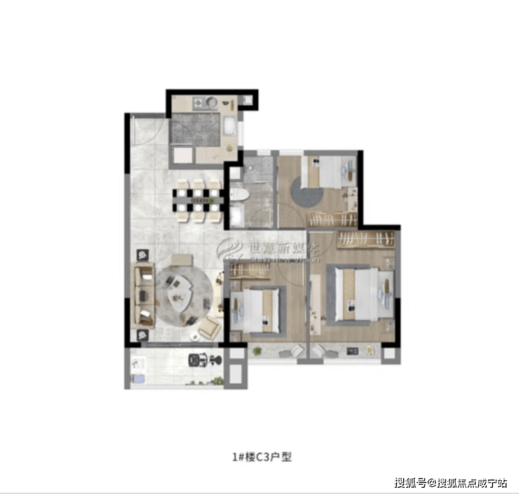 建面约108㎡3房2厅2卫,做到了三开间朝南+双阳台设计+主卧套房设计+南北通透,该户型得房率非常高。