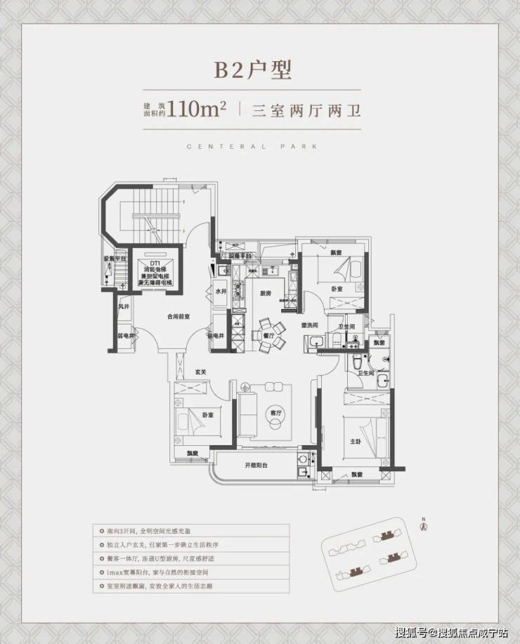 再来看建面约110㎡中间套竖厅户型: