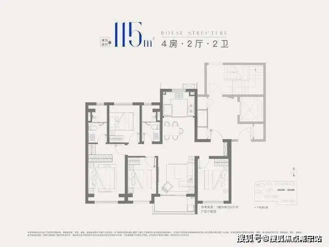 建面约115㎡4房2厅2卫,做到了四开间朝南+全卧室带飘窗+主卧套房设计,一步到位的大四房户型。