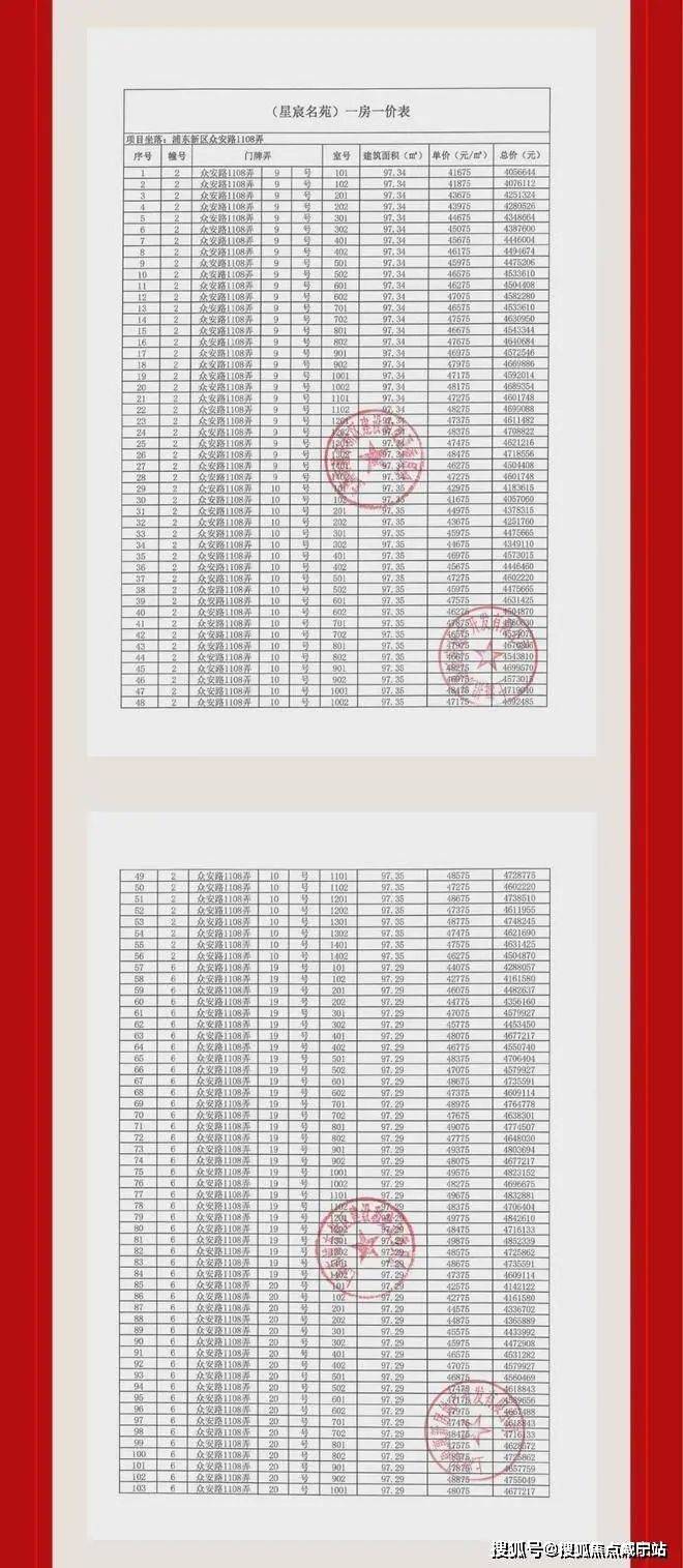 一房一价表如下