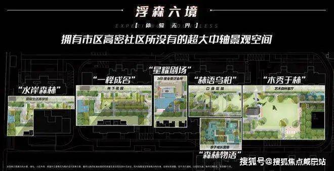 社区将自然意趣与自然景观融入园中,呈现星光森境的景观,以超长绿廊中轴为依托,打造了浮森六境璀璨盛景。