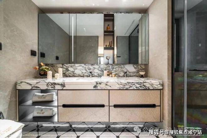 另外采用意大利 “大花白”天然石材实现地墙满铺,双台盆与双镜柜的对称设计复刻五星酒店规制,美妆冰箱精准控温呵护护肤品,奢华至极!