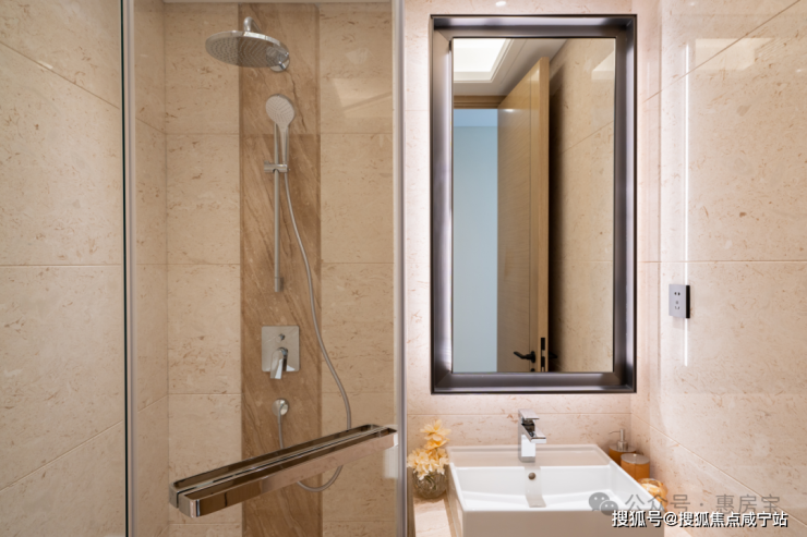 更是在相对不敏感的橱柜采用进口德国旭勒品牌,彰显诚意。嵌入式冰箱、嵌入式洗碗机也是高端住宅才有的配置。灶台油烟机、洗碗机、冰箱皆是西门子品牌,还有科勒的厨房水槽龙头、净水系统。卫生间有汉斯格雅的花洒、龙头,科勒的马桶以及淋浴房。值得一提,项目层高有约3.05米,比市面常规户型高了约15公分。