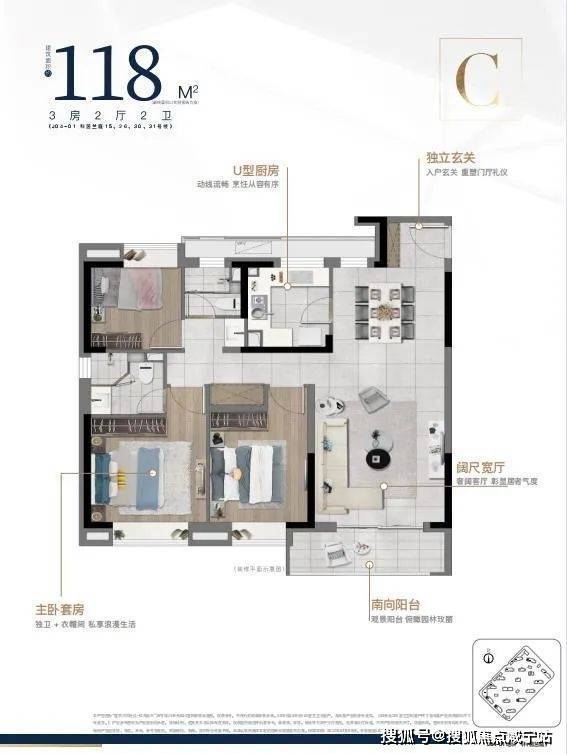 建筑面积约100㎡/118㎡三房两厅两卫,三口之家/三代同堂从容满足,南北通透外,餐客一体,动静分离居住舒适度更高,三开间朝南,三房全飘窗,日常在阳台上饲花弄草,生活将被赋予高仪式感。