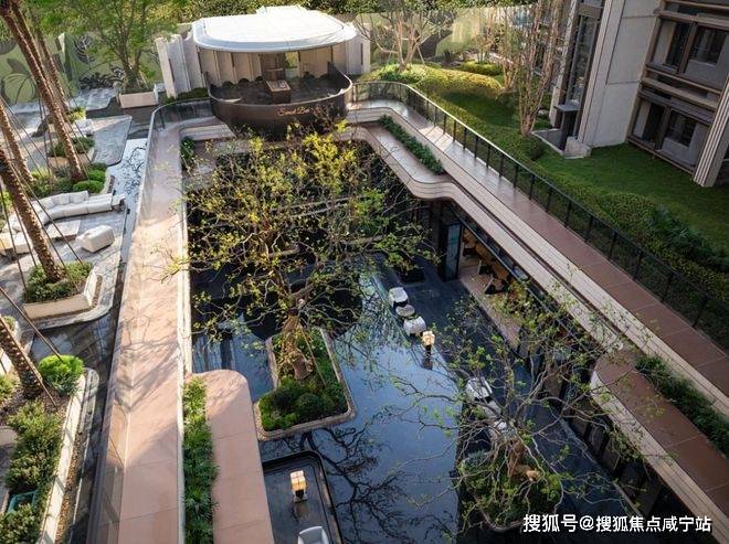 实景呈现的岛屿水院,作为保利天奕五座全球大师花园之一,在银海枣树阵下沉式庭院镜面池畔卡座的呼应中,成为未来居者沉浸自然的惬意之地。温柔闲适的落日廊吧,犹如身处海岛之畔,感受蓝调时刻的优雅情调。