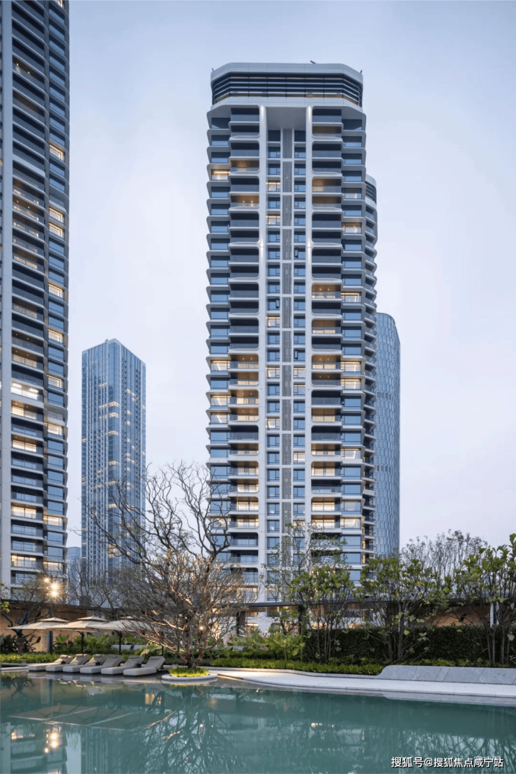 在建筑设计上,项目采取了极具辨识度的“游艇式”建筑语言,可以令人“穿越到未来”的先锋设计。立面从湾区塔尖生活范本深圳招商玺汲取灵感,通过游艇曲线美学、仿游艇甲板设计,一线亲水布局,创造出全景舱观湖视野,以革新性设计理念重构流体建筑美学,打破了传统住宅建筑的平铺直叙,营造出海浪般流动的质感和韵律,通过立体解构手法实现建筑形体的悬浮感与艺术张力,构建出如游艇般舒展而流动的天际线,与远香湖的水岸线形成视觉共鸣。