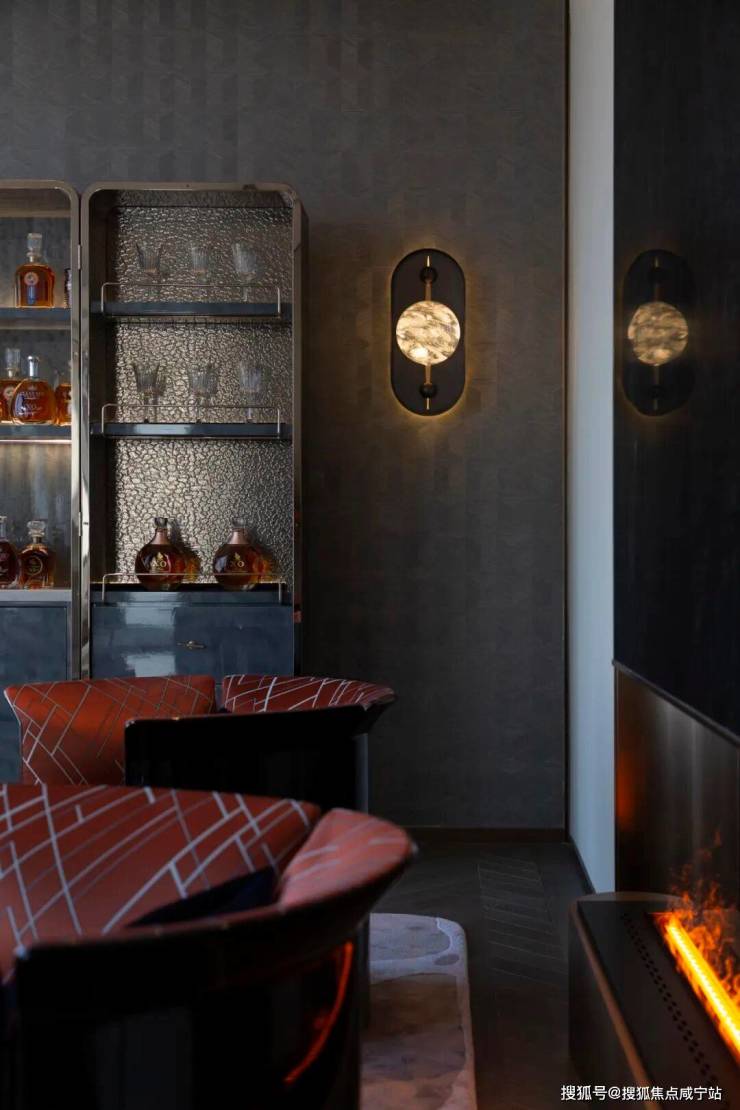 亮面瘤木椅背,搭配蓝色木皮和艺术玻璃的组合;在卡拉瓦乔酒窖光线般的灯光渲染下凝实感官体验,自然沉浸其间。张弛有度的比例,划分利落严谨的形体;自带雪茄恒温箱冷藏室的定制酒柜,及意大利水晶酒具DAVINCI配套,带来极致的品鉴享受。