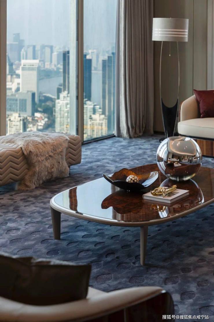 走道端处香槟色金属雕塑,形类城市高楼,又若恋人彼此依偎;全采光套房拥揽白日上海黄浦的忙碌、繁华,也收藏夜晚灯火阑珊的宁静、美好。