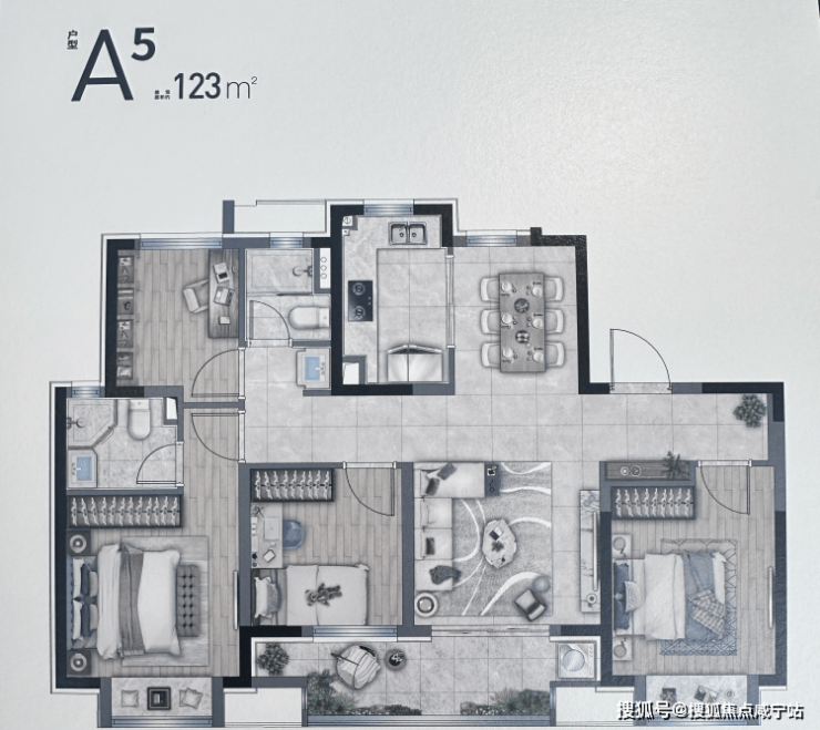 建面约123㎡的4房2厅2卫户型,超大面宽南向阳台、整体南北通透、主卧套房的设计,提升居住空间。