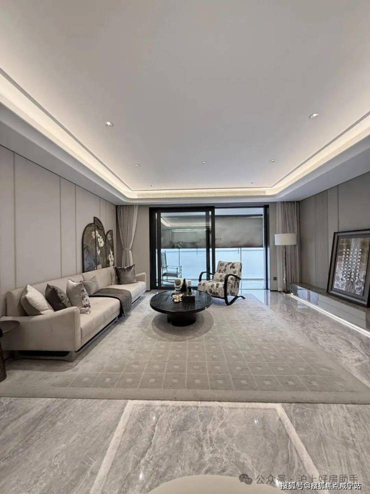 电视背景墙采用卡慕白的石材+皮革造型,弧形吊顶,相当讲究,连空调出风口的形状都打造为海上·清和玺logo山茶花的形状~~三大件为大金(或同等档次)中央空调和地暖,新风系统为百朗(或同等档次),南向阔景阳台,采光视野一级棒!