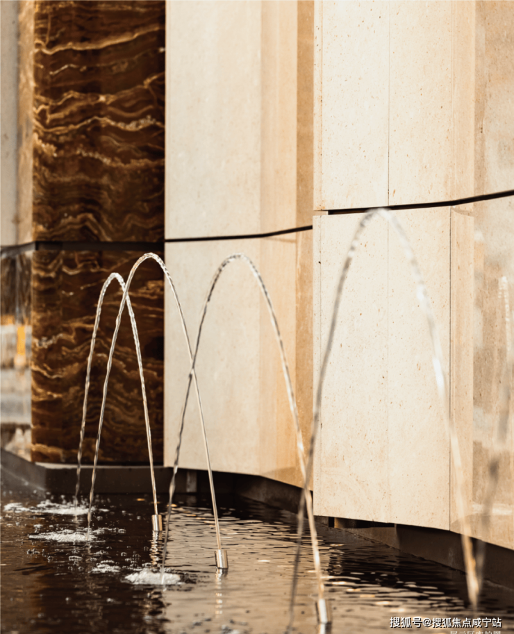 在门庭外,辅以两侧具有仪式感的跳泉水景,将建筑的圆弧美感与自然水景相合,共同构成海上·清和玺“贵雅清和”的城市界面。