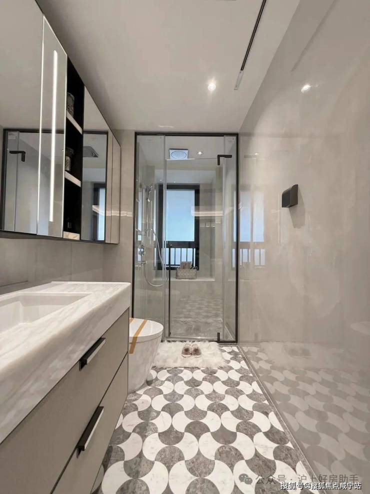 奢石台面,皮革饰面柜抽屉,侧端设置金属收纳开放格;定制镜柜,中间的透光玉石直接提升了高级感,镜柜内部配备了美妆冰箱+美妆灯条+轨道收纳!