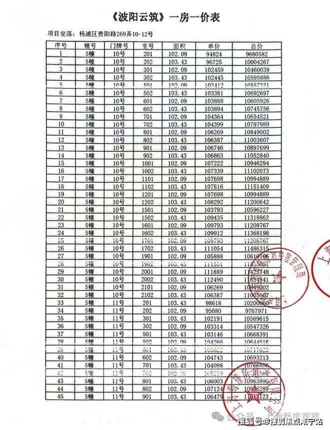 上期一房一价表如下: