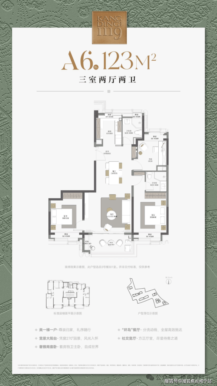 建面约120㎡边套3房:位于整个社区的最西侧,约270°的巨幕视野让这个户型的采光、视野达到顶峰,低总价的上车首选;