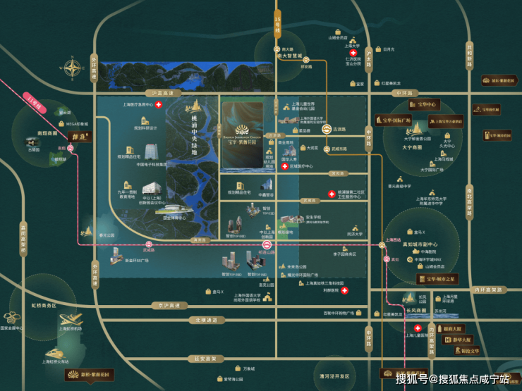 以中央绿地为轴,依托政策优势,构建功能组团,推动产业集群发展、区域规划落地,打造全新的上海市中心国际社区。