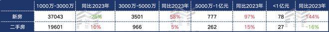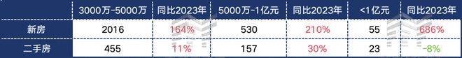 2024年,上海3000万-5000万的新房成交套数,同比2023年有164%的涨幅,5000万-1亿元新房成交套数,同比2023年则有686%的涨幅。