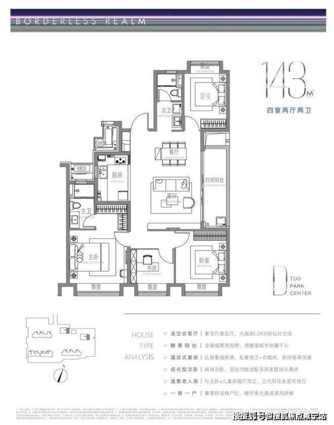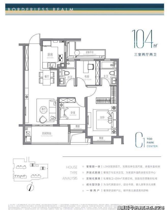 建面约104m²户型特点:LDKB洄游式竖厅+开放式厨房,生活尺度无限拉伸,主卧近6m²灵感空间,承载更多功能可能,成长型的次卧,书房儿童房随心所欲。