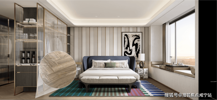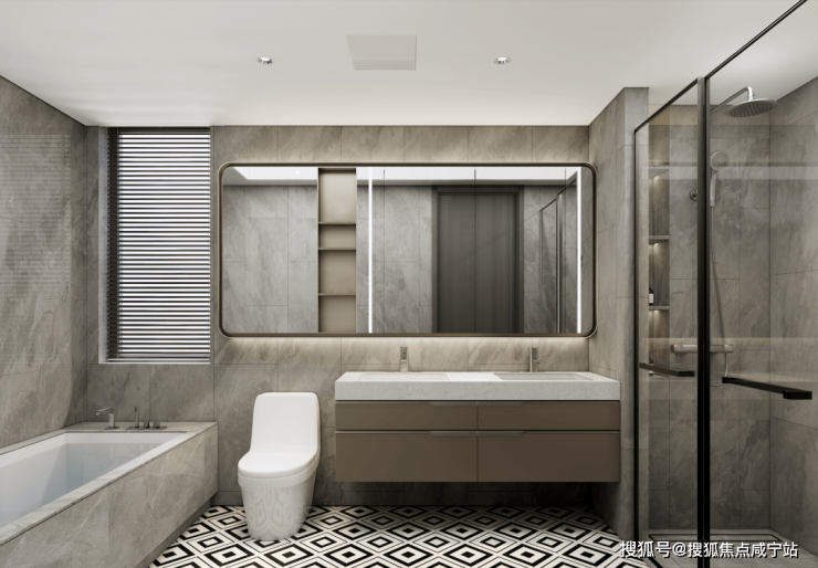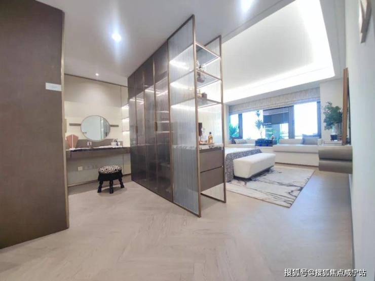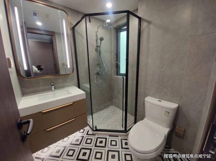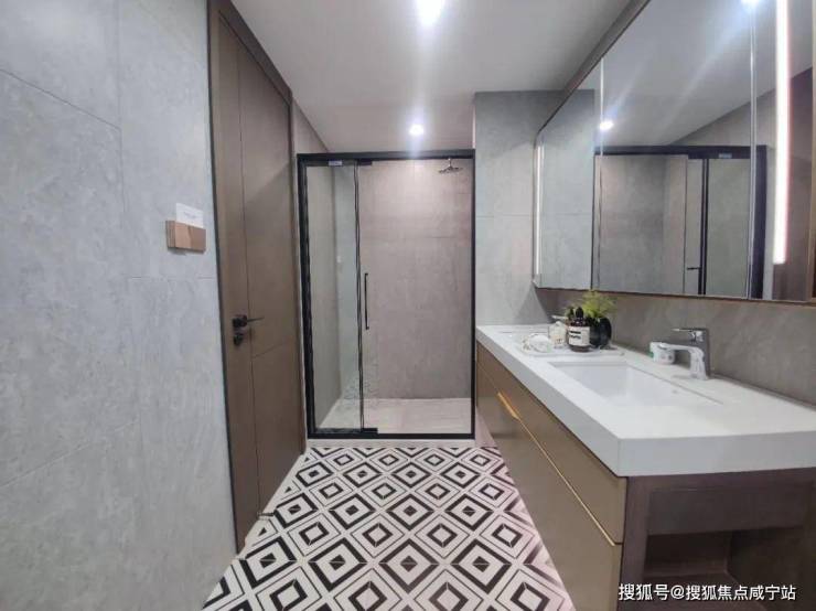 卫生间里的弧形镜、地面拼花、金属复古移门...各个空间都呈现出细节的精致感。