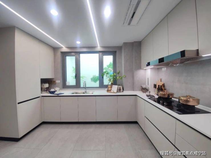 厨房U型操作台面,操作空间充裕;更值得点赞的是预留了双开门冰箱位置,你要知道普通百平米三房,基本只预留单体冰箱的空间。