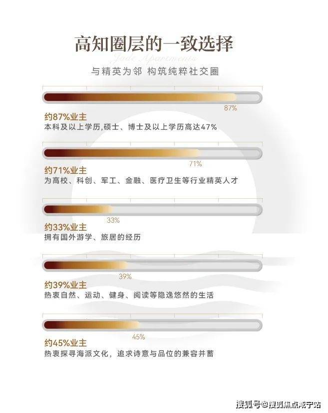 据统计,映江润府售楼处电话:400-8800-703 业主约87%为本科及以上学历,硕士、博士及以上学历高达47%!千金买房,万金买邻,像映江润府这样高比例的高知住区全市少有,而对于年轻的城市菁英们来说,无形的圈层代表着对社会资源的占有,决定着人生的高度。