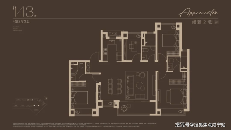 建面约 143㎡的四房,四开间全明,适合三代同堂,各有私密空间;