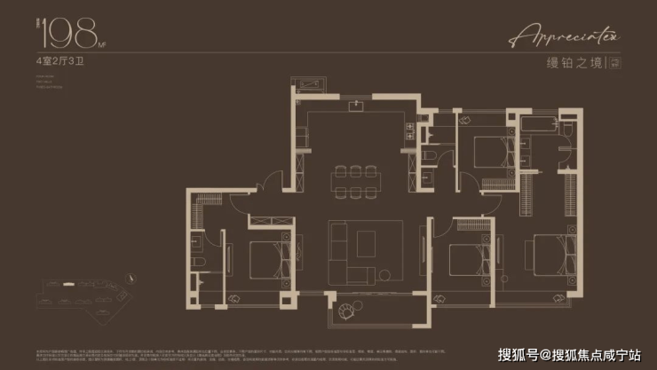 建面约 172 - 198㎡的大平层,四房三卫 + 阔景阳台,宴请亲友超有面儿。