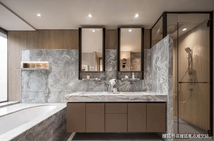 墙面,严选安第斯雪或晓山青珍贵石材,与木饰面、特色定制墙布组合设计;客厅、餐厅、卫生间等区域地面定制石材,赤足走过,温润细腻的触感。