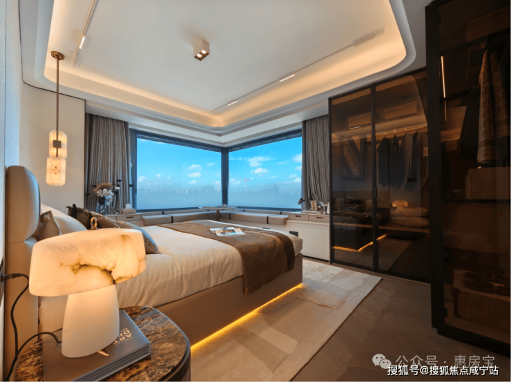 绿城逸庐售楼处电话☎:400-8800-703✔✔主卧套房设计,边套户型更独享270°超大转角飘窗,将广阔视野与充沛采光一并纳入怀中,无论昼夜晴雨,窗前皆是无遮挡的风景画。地面铺设柳叶拼实木复合地板,温润而富弹性,光脚踩踏也倍感舒适。