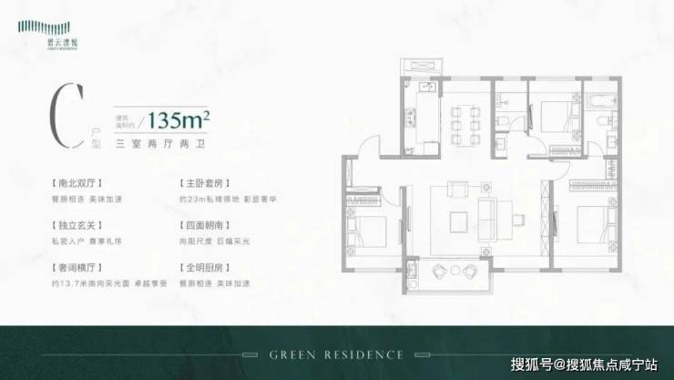 此户型可以说是改善人群非常喜欢的户型,建面约135㎡3房2厅2卫设计,动静分区,四开间朝南,各空间尺度奢阔,还有一个超大面宽的景观阳台,实现功能性和舒适度兼得。