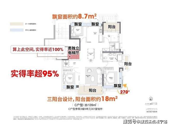 值得一提,该户型配备双开门电梯,享类独立电梯厅,把这部分附加使用面积算上,整体实得率逼近100%!
