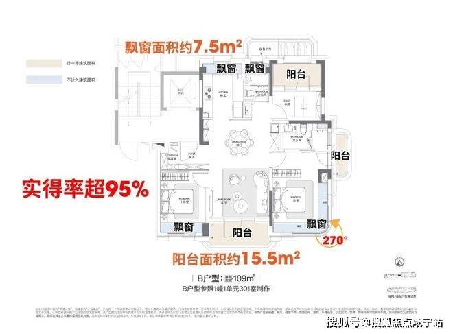 建面约109㎡B户型,配置 双阳台+主卧一步阳台 ,仅阳台面积就有约15.5㎡(常规户型阳台仅5—6㎡),飘窗面积约7.5㎡,实得面积约105㎡, 实得率超95%