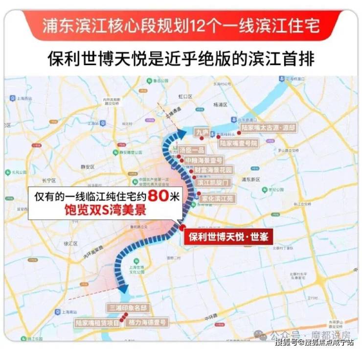 保利世博天悦是近乎绝版的滨江首排,直线距离黄浦江只有约80米,与江几乎“触手可及”