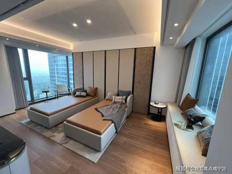 印象最深的是这个户型的主卧空间,270°转角窗的同时,在另一个方向还有窗户,视野、采光效果都很绝,真正做到了“通透”二字。