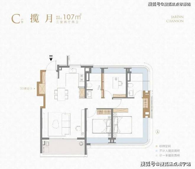 不到90㎡的建面实现3房一步到位,功能性上符合市场需求!同时利用科学的收纳和S墙设计保障了室内空间的井井有条,又通过大量飘窗和阳台等提升尺度感,尤其是厨房带飘窗你见过吗?②建面约107㎡3房2厅2卫户型:
