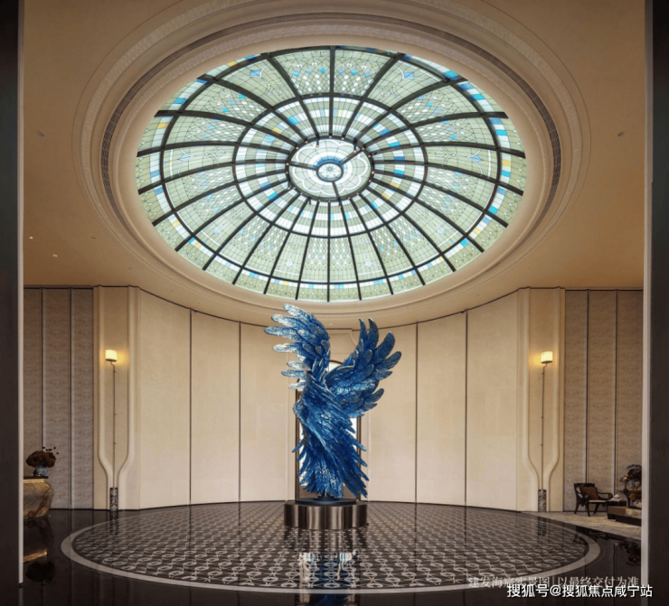 彩绘玻璃穹顶漫射柔和天光,艺术拱门与浮雕墙面交替排列,中央紫蓝渐变花艺装置描摹四季流转之美,可上演私享音乐会、业主演说会、亲子读书会、浪漫下午茶等,复现百年和平饭店的顶层社交场景。