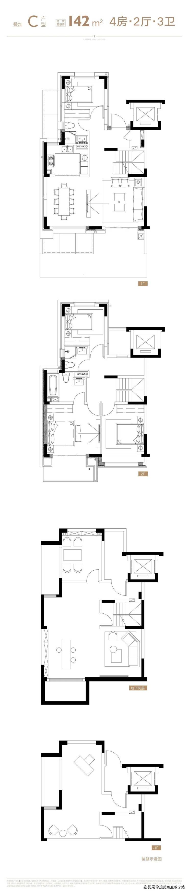 主力产品为139-142㎡叠加别墅(北区四层)与158-165㎡联排别墅(南区主力),总计仅141套。户型设计强调空间纵深感: