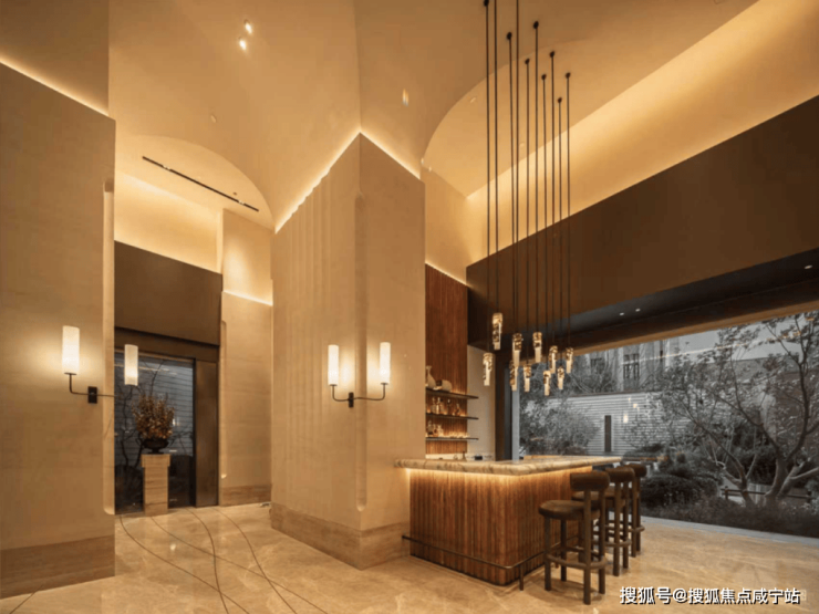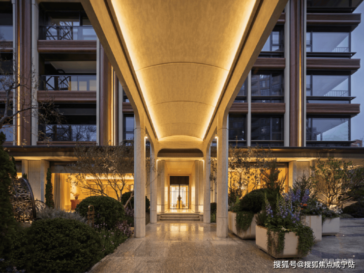 设计团队把连廊下方的空间和花园景观揉在一起,做成了一条“线性美术馆”——拱形的吊顶,考究的廊柱,让归家成为一场艺术。