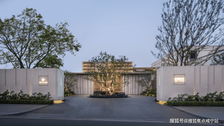 社区主入口,乌桕树与环形水景互为映衬,8块天然开采手工雕琢而成的奢石,蕴含着石来运转美好寓意。