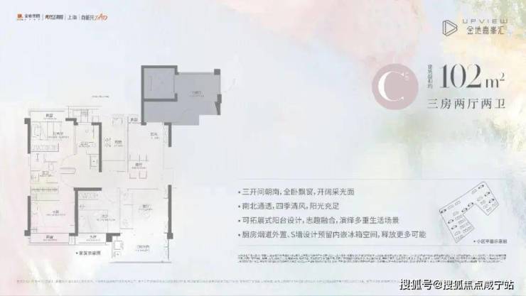比如主力在售的建筑面积约102㎡3房2卫C户型,三开间朝南+南北通透,功能性拉满满足家庭型客户需求。