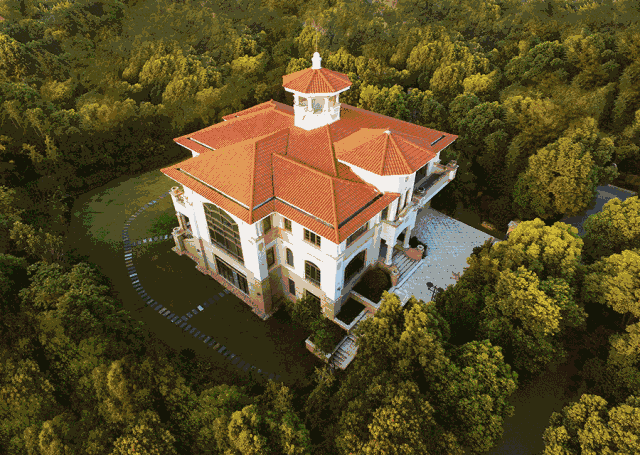 航拍俯瞰,浓荫绿树,这可不是普通别墅区可比拟的,每一棵树没个几十年是长不到这尺度的。
