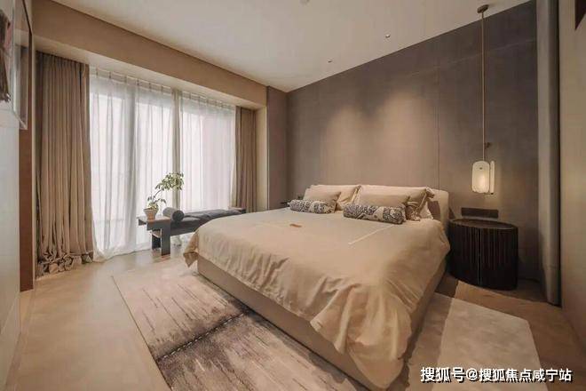 次卧背景墙采用米色和灰色硬包布料组合,搭配弧形墙面处理,品质感满满。