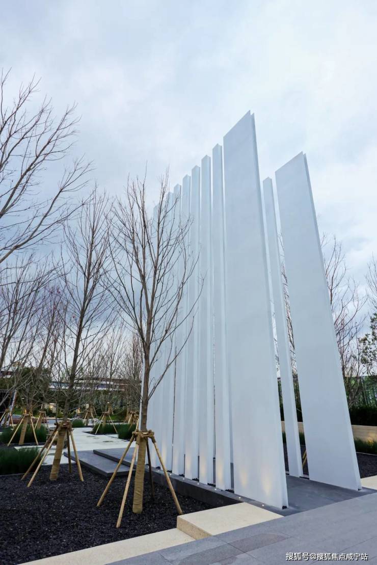 穿过公园进入社区前场,仪式感铺面,类高奢酒店设计,约10米高的「精神之门」矗立。