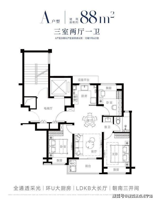 户型上:南北通透+LDKB一体化+主卧套房+全卧飘窗设计。