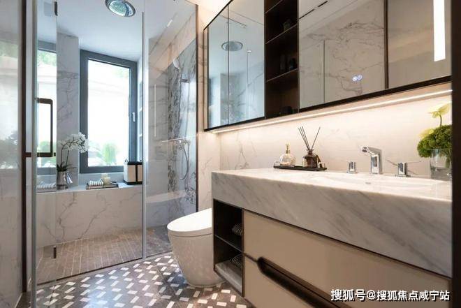 还有很多品质细节,比如全屋大量使用到奢石,归家门厅墙面采用石材镶嵌意大利毕加索奢石,地面采用大理石水刀海派拼花等,更显高端审美和品味。