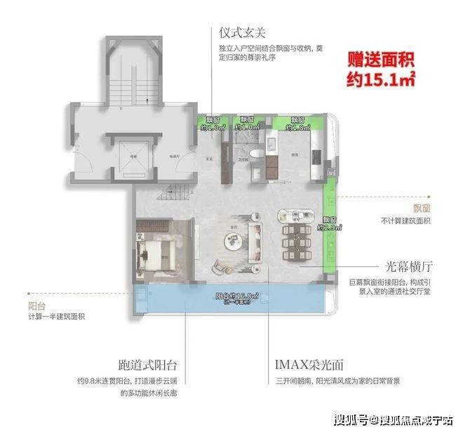 这个户型有约9.8㎡的飘窗,约7.2㎡的阳台,整体的附赠高达约13.4㎡。这是目前上海外环沿线,是附赠率最高的一个小高层产品。