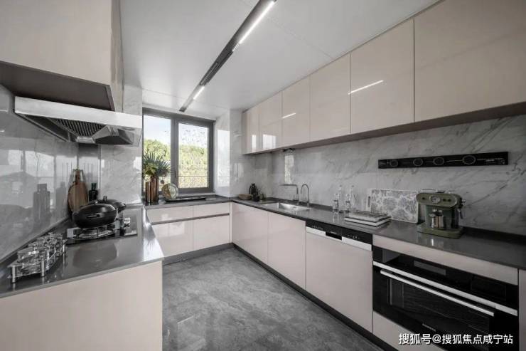 绿城沁蘭园厨房配备德系西门子三件套,包含油烟机、燃气灶,洗碗机,还有轨道插座、双层厨具收纳柜、凉霸、灯带等贴心设计。