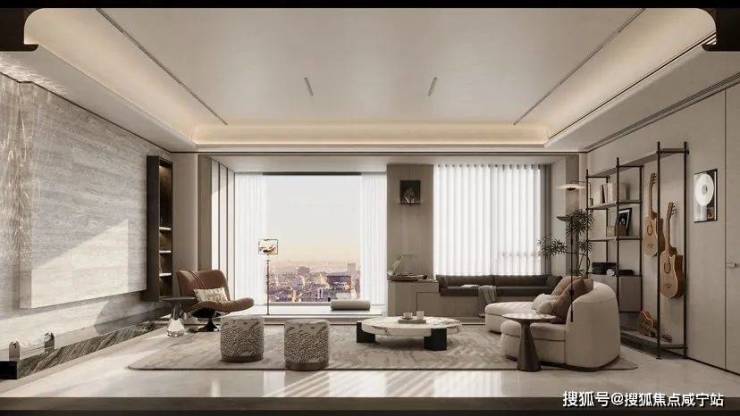「中国铁建&万科·朗拾花语」售楼处电话: 400-960-1656 客厅顶部用了艺术漆,隐约有光泽感,并且做了弧形吊顶,背景墙采用了大面积米灰色岩板,以上豪宅的手法再次出现在小户型,只有尺度足够开阔,这些做法才成立。