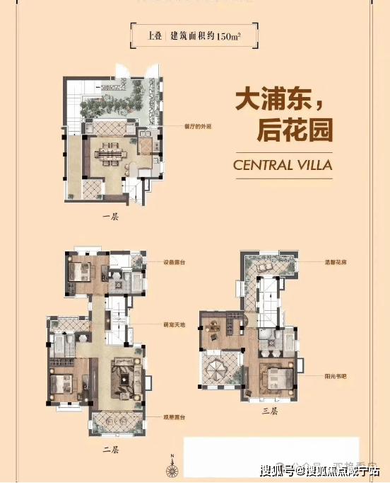 上叠户型是建筑面积150平米的三层,4房2厅中西双厨的全套房设计,特设独立花园入户通道,保障业主私密性。