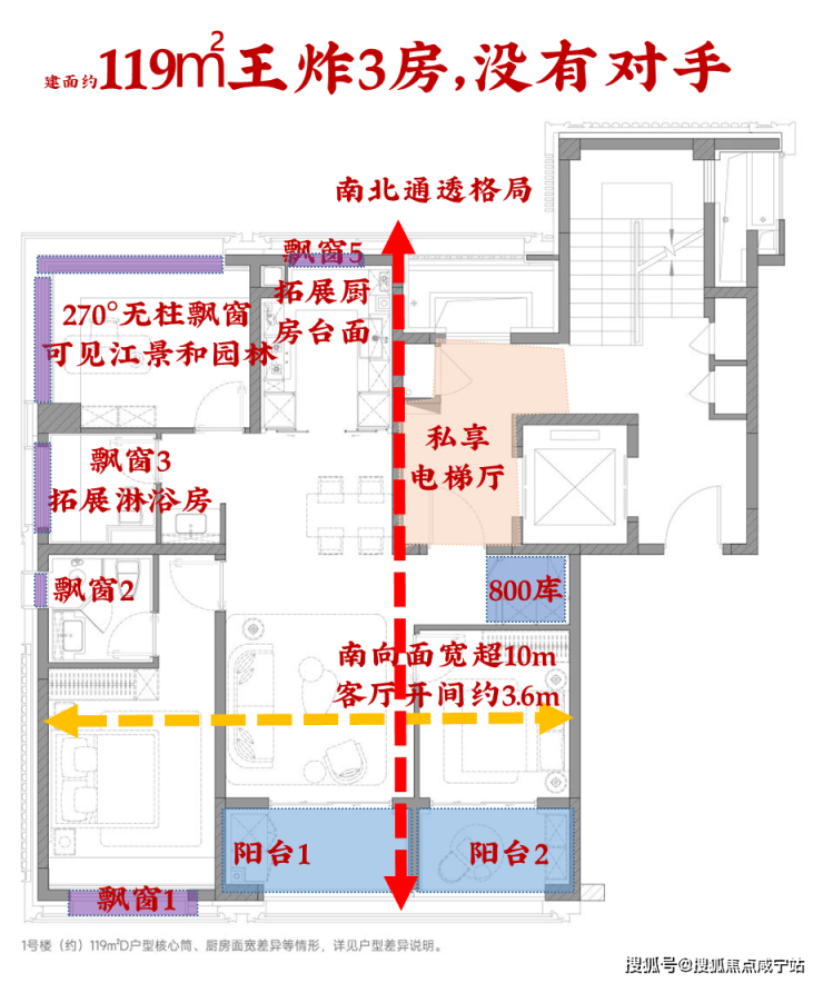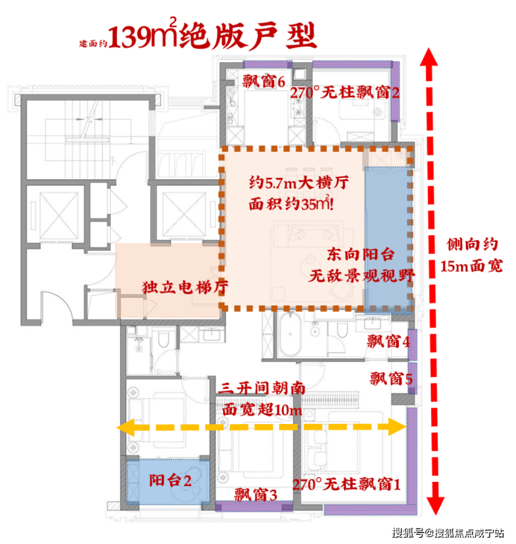 整个户型的实得率达到了94%!2阳台+2个L型大飘窗+全屋6飘窗+4面采光!